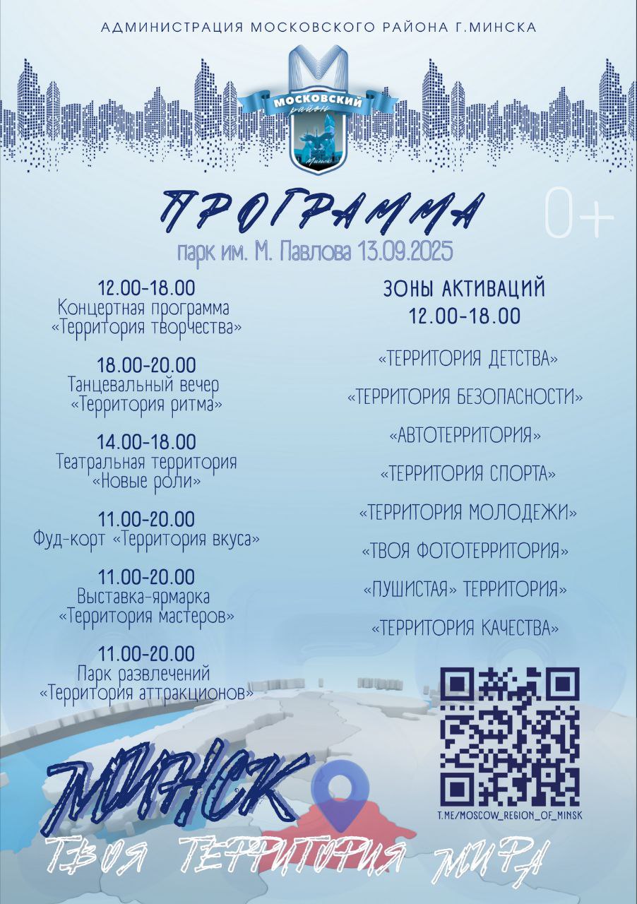 - ⚽ Территория спорта: активные игры, велобиатлон, спортивные зоны от БГУ и БГПУ.
